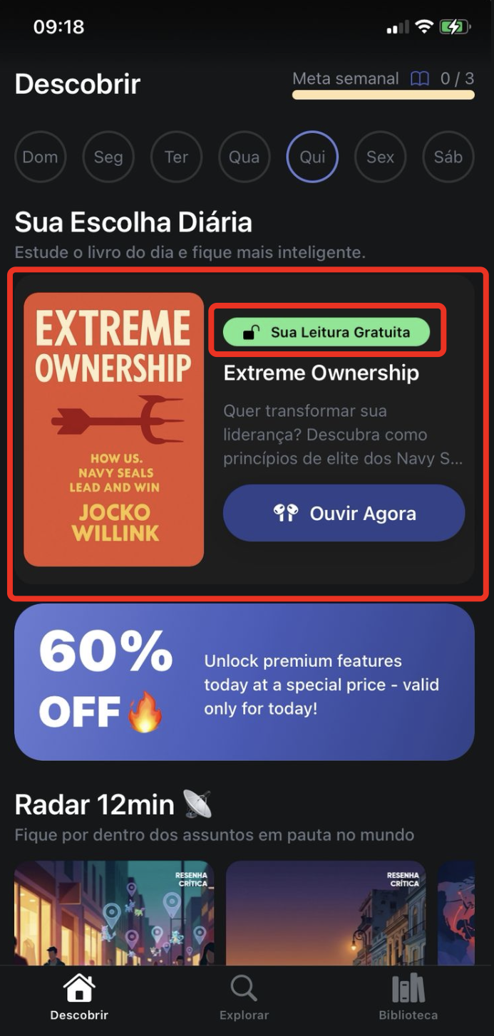 Durante o período de teste, você poderá ouvir gratuitamente apenas a Recomendação Diária — ou seja, um microbook por dia, escolhido pela curadoria do 12min.
