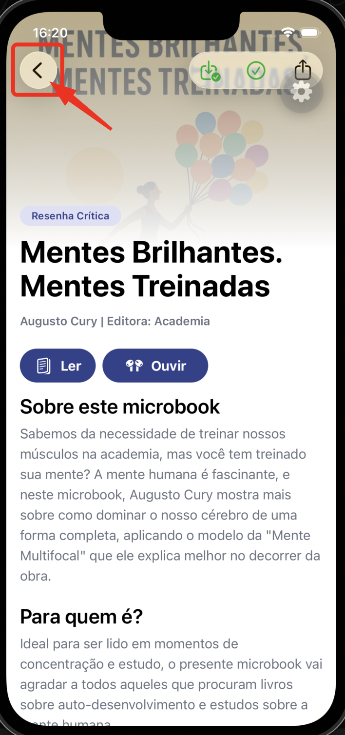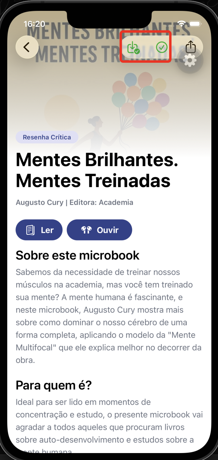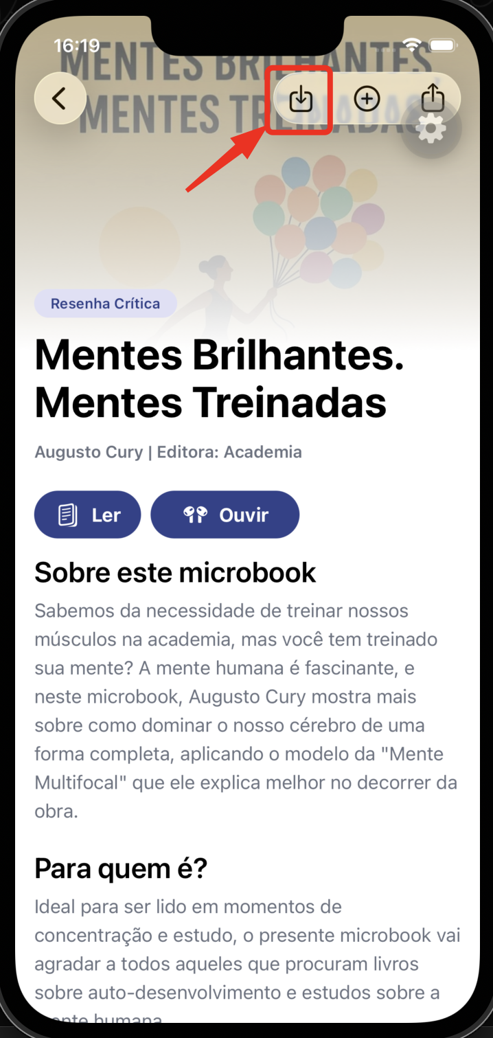 Na tela do livro, toque no ícone de download (seta para baixo) no canto superior direito.