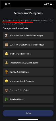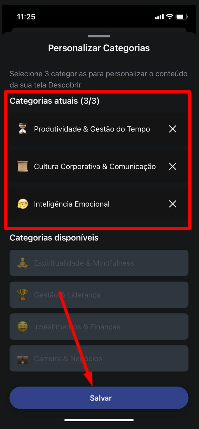 Selecione as 3 categorias que você deseja visualizar. E toque em Salvar.