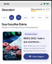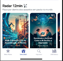 Logo no início da tela, você verá a Escolha Diária — uma recomendação especial selecionada pelo 12min para você começar o dia aprendendo algo relevante.