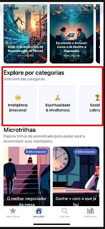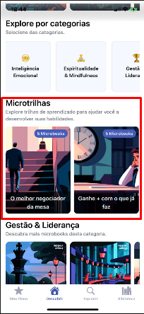 Descendo a tela, você poderá explorar microbooks organizados por categorias, como carreira, produtividade, liderança, finanças e outros temas.